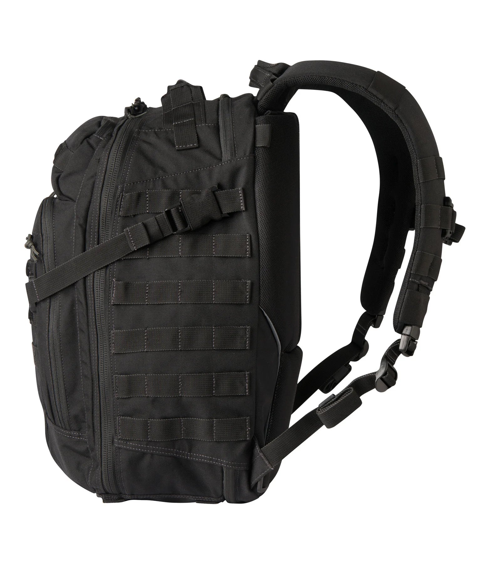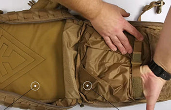 תא מערכת Hook and Hang Thru™ החדשנית שלנו נפתח באמצעות רוכסן בחלקו העליון והתחתון של תיק הגב, ומאפשר לפריטים ייחודיים כמו נרתיק הרובה של First Tactical או ציוד טקטי גדול אחר לעבור דרכו ולהיתפס בצורה בטוחה ונוחה.